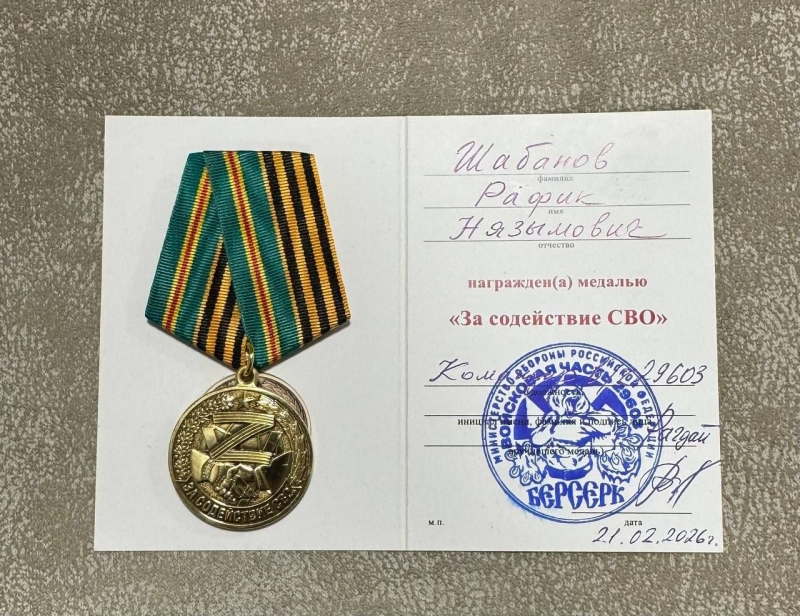 За систематическую личную помощь и поддержку, оказываемую как самим имамом, так и всей общиной, Рафик- хазрату Шабанову была вручена медаль «За содействие СВО» от подразделения «Берсерк» Министерства обороны РФ.
